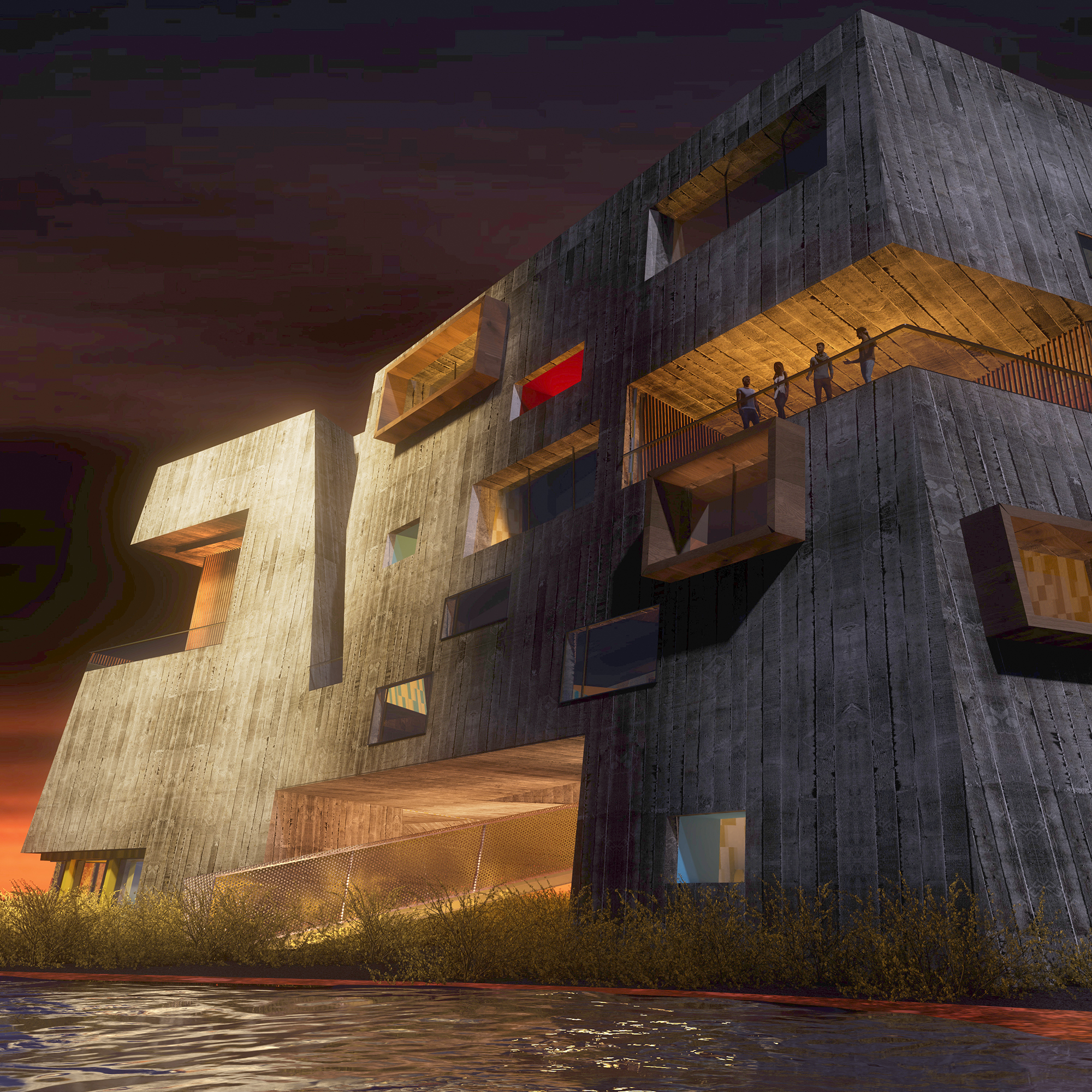 Inspired by the crisscrossing tracks of skiers, the building is proposed to be clad in stainless steel shingles that glisten in the winter sun. It would serve as a beacon for skiers on slopes far away.