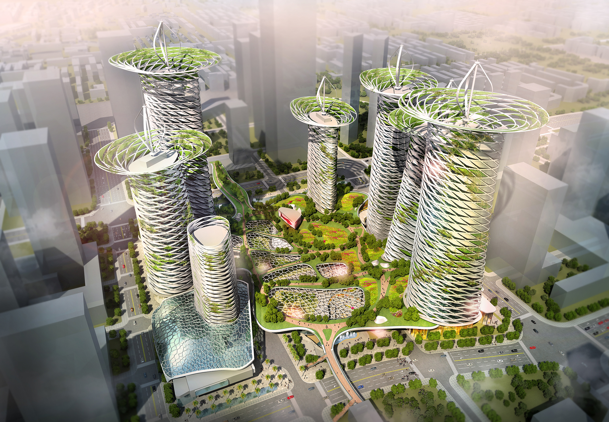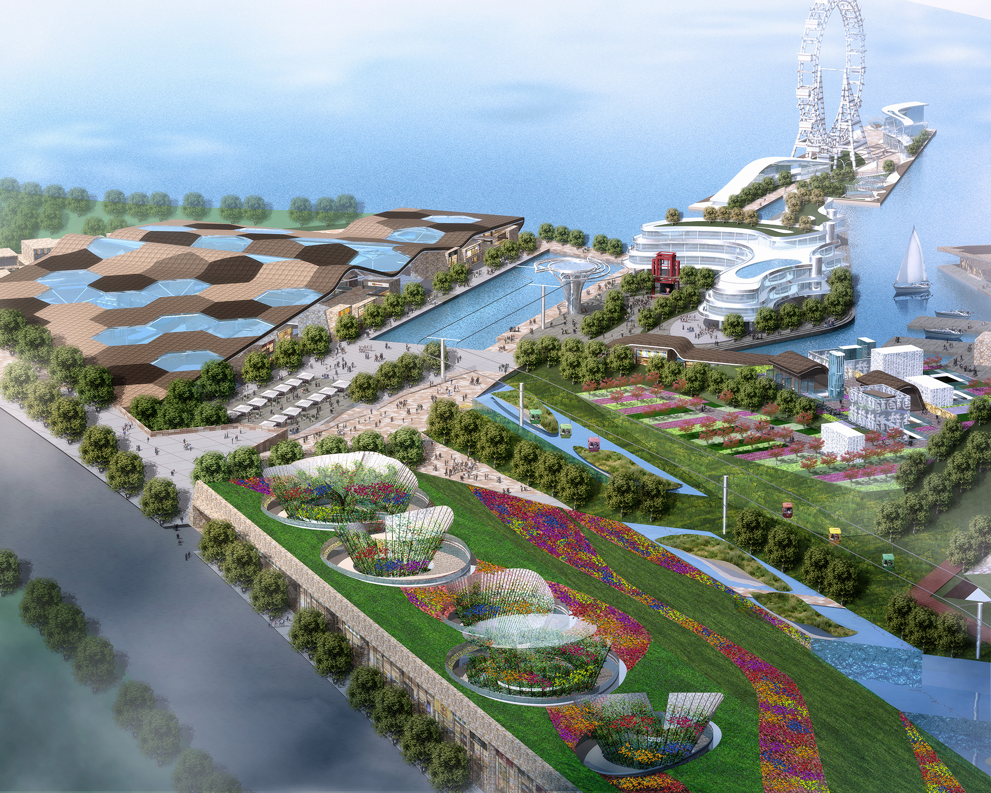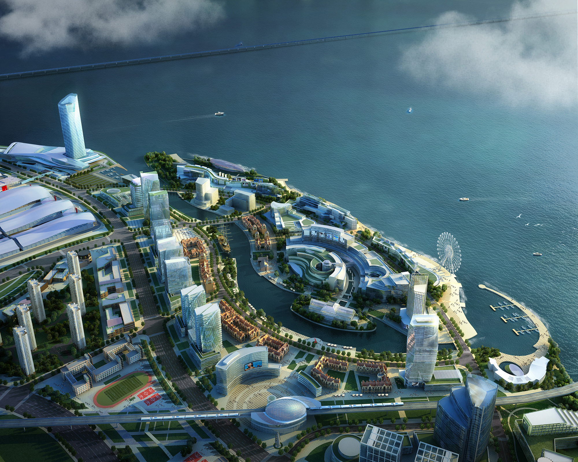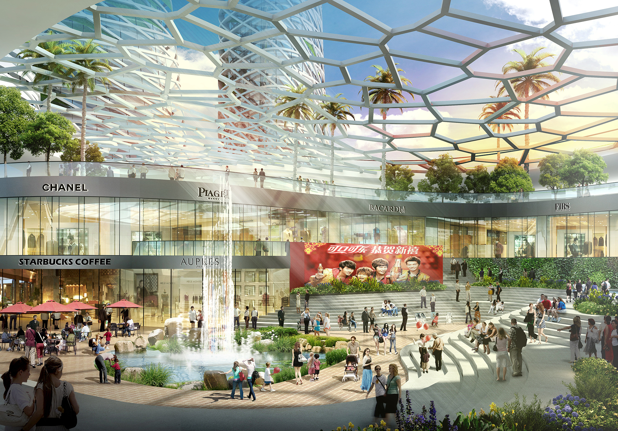 Zhuhai’s tropical landscapes are the theme of rooftop landscapes interconnecting all the structures, while the tall buildings recall the surrounding mountains.