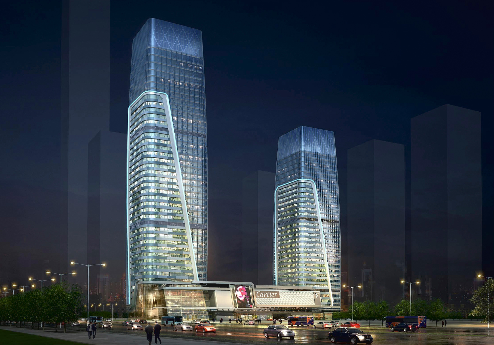 The program includes a Hyatt Regency, speculative office space, and a retail podium.The twin towers will be the most iconic building in Xian’s CBD.(While at Nadel Architects)
