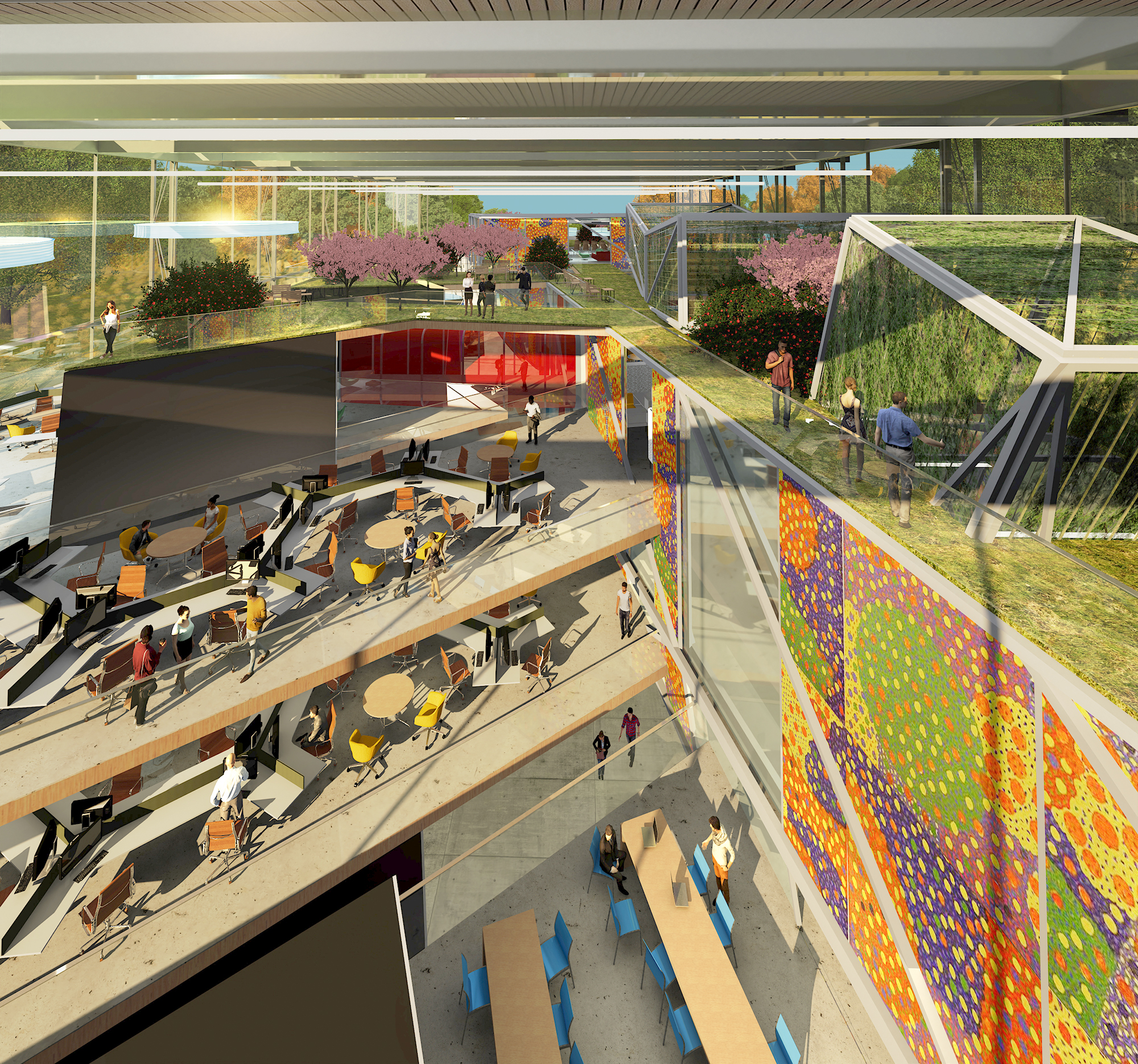 A large program of high-rise office towers, retail, and subway connections is organized as a landscape of big trees and podium with an undulating rooftop park. Bridges flow from the park making connections with the surrounding environment.