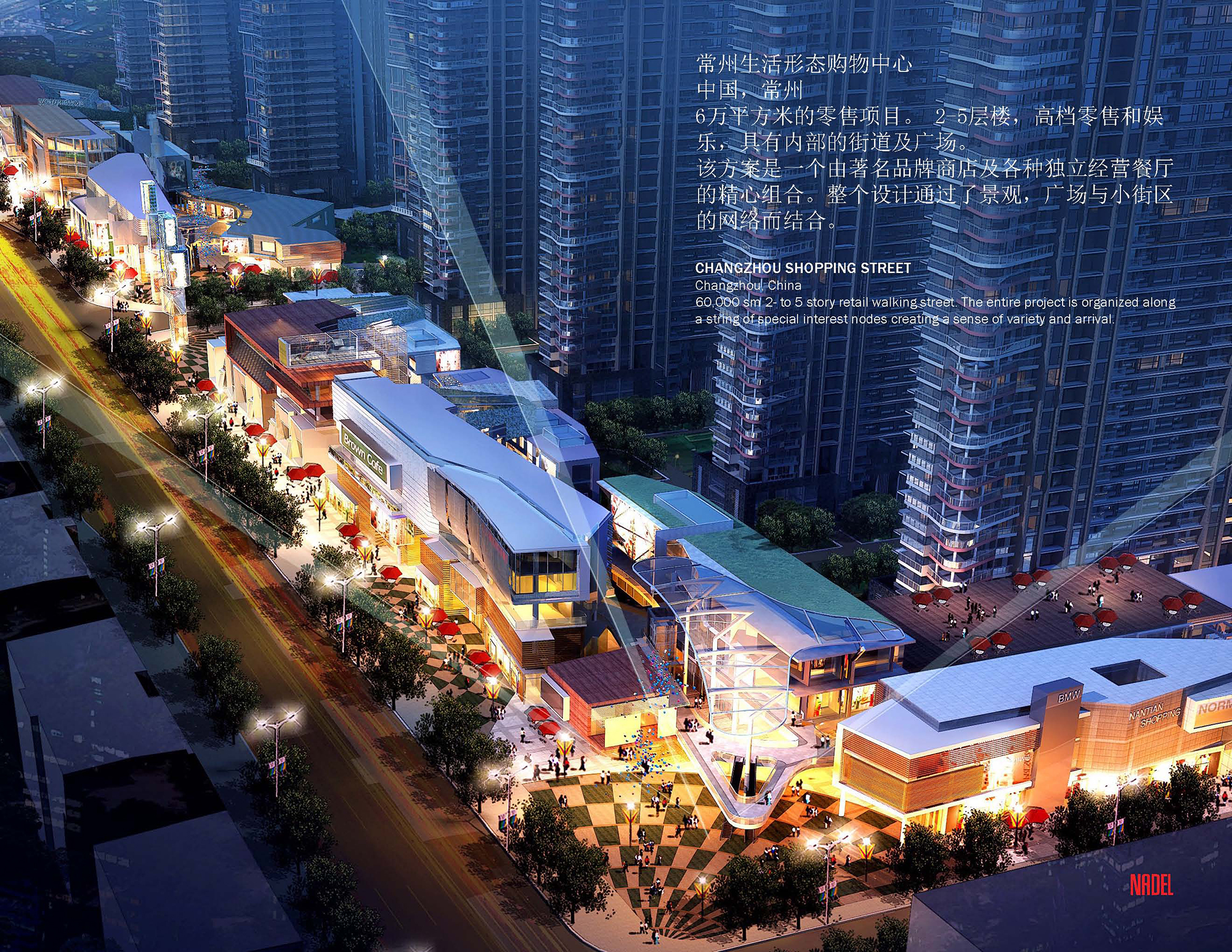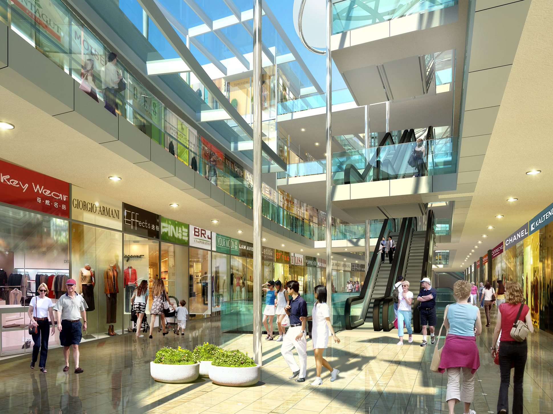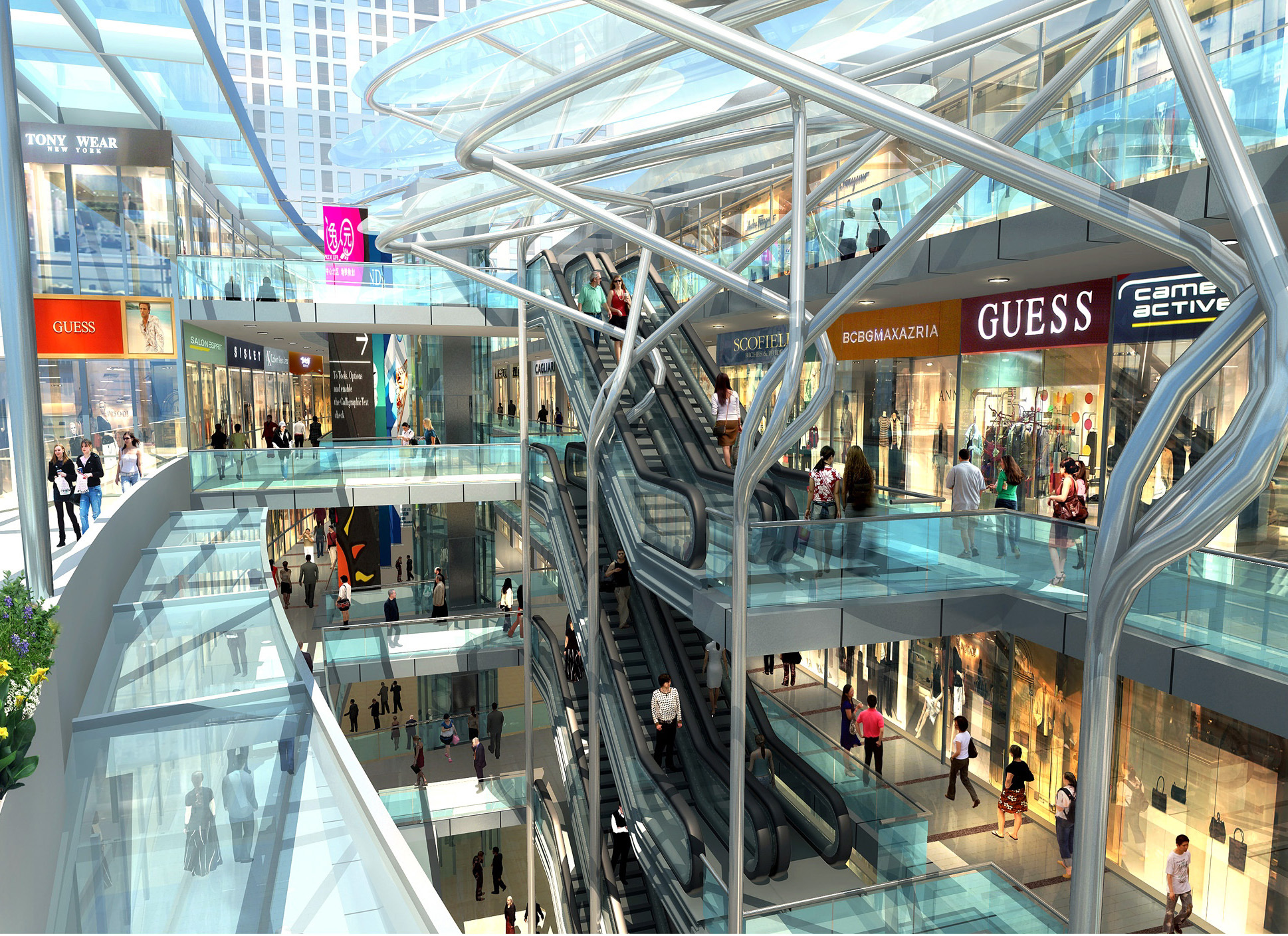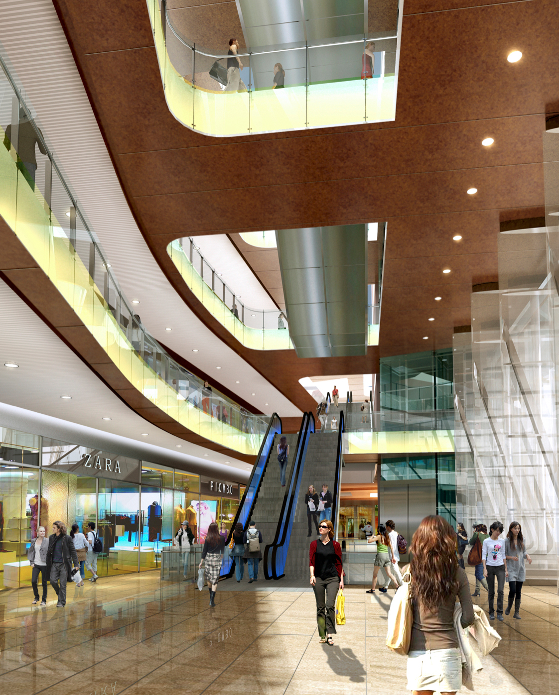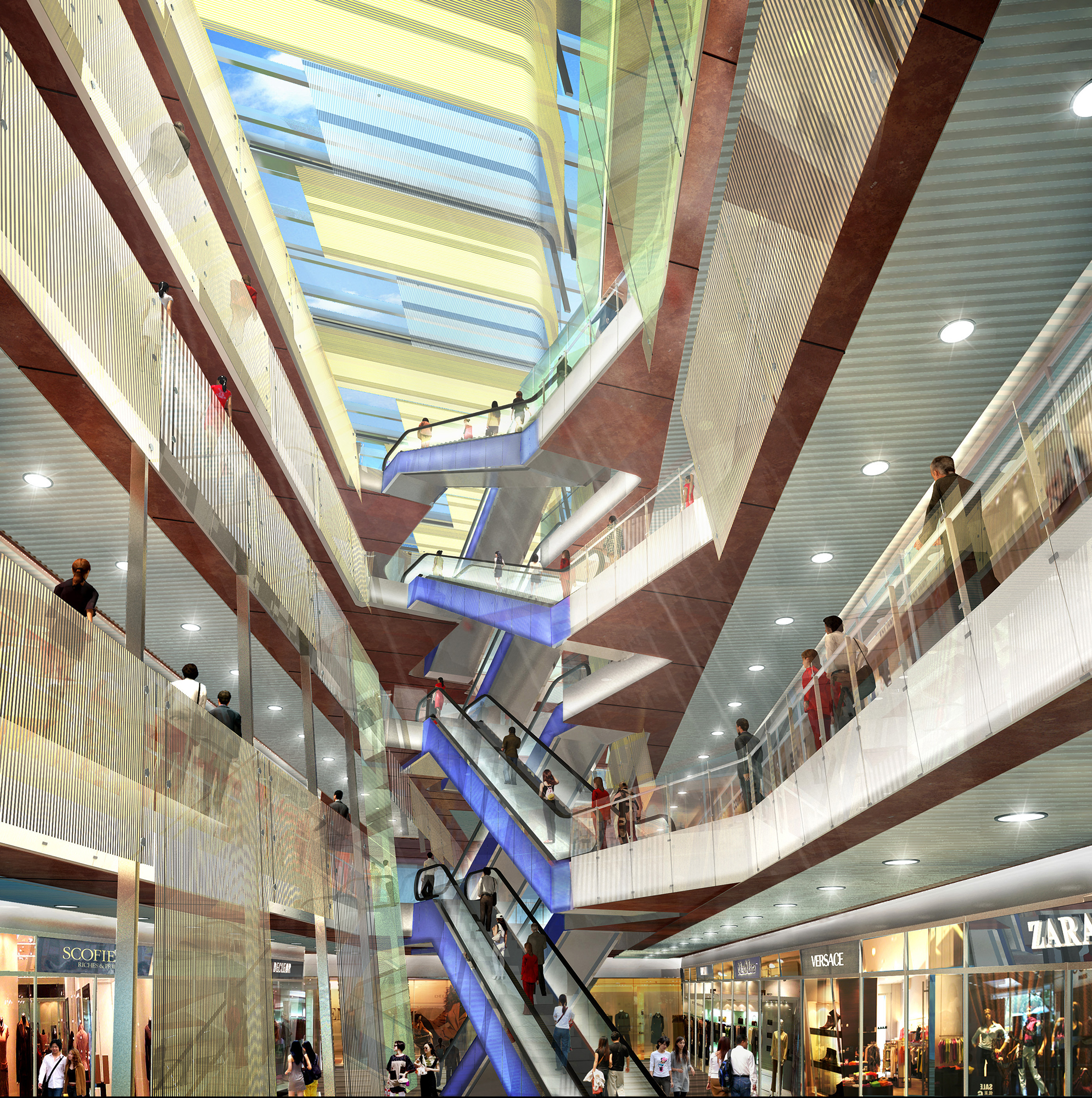 Skylights in connecting atria create a seamless indoor-outdoor shopping experience. Retail spaces are articulated as separate buildings to reduce scale and add life to the streetscape. (While at Nadel architects)
