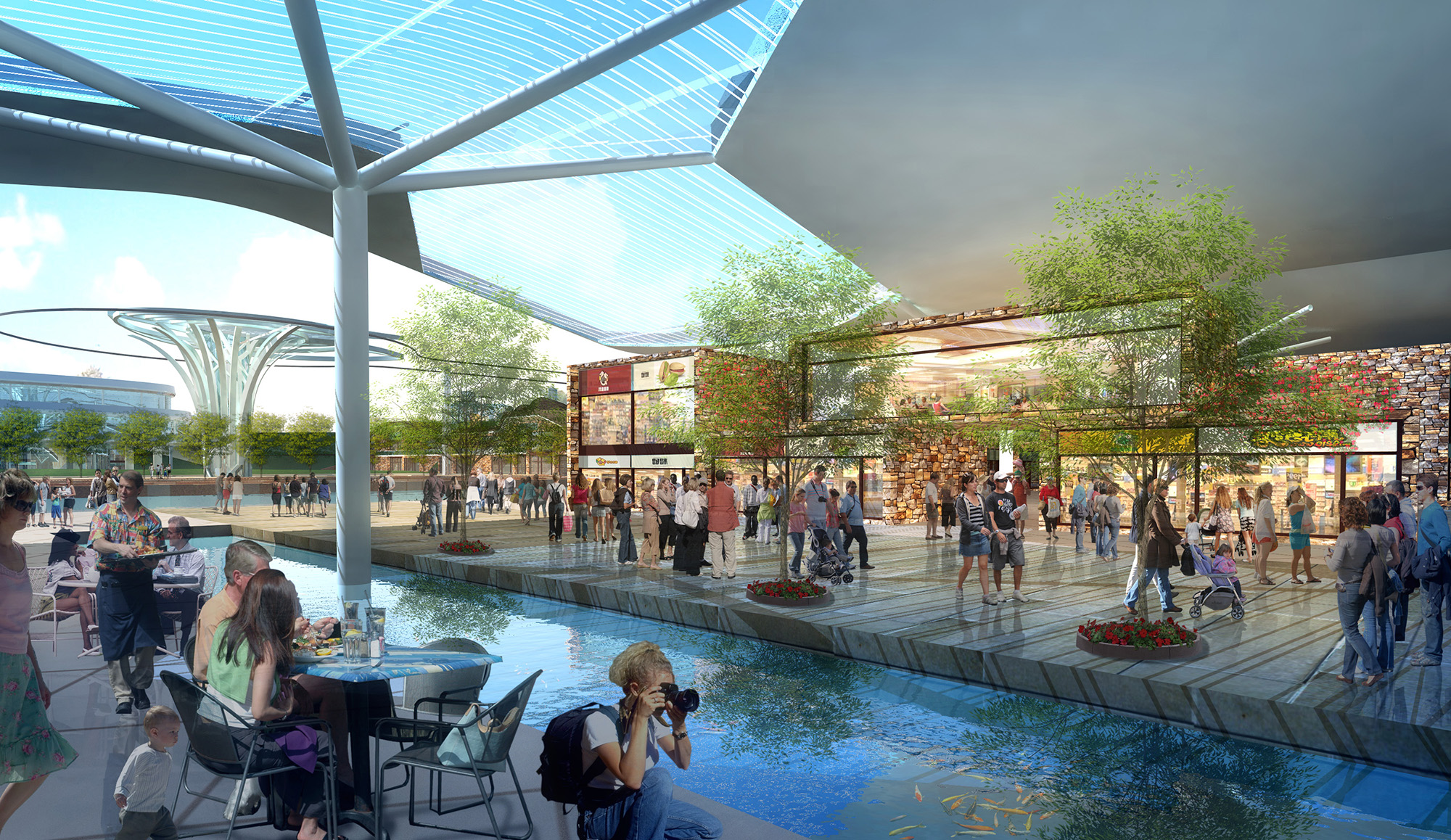 Various schemes. Extensive landscaping at all levels integrates conference, hotel and retail with the urban environment.