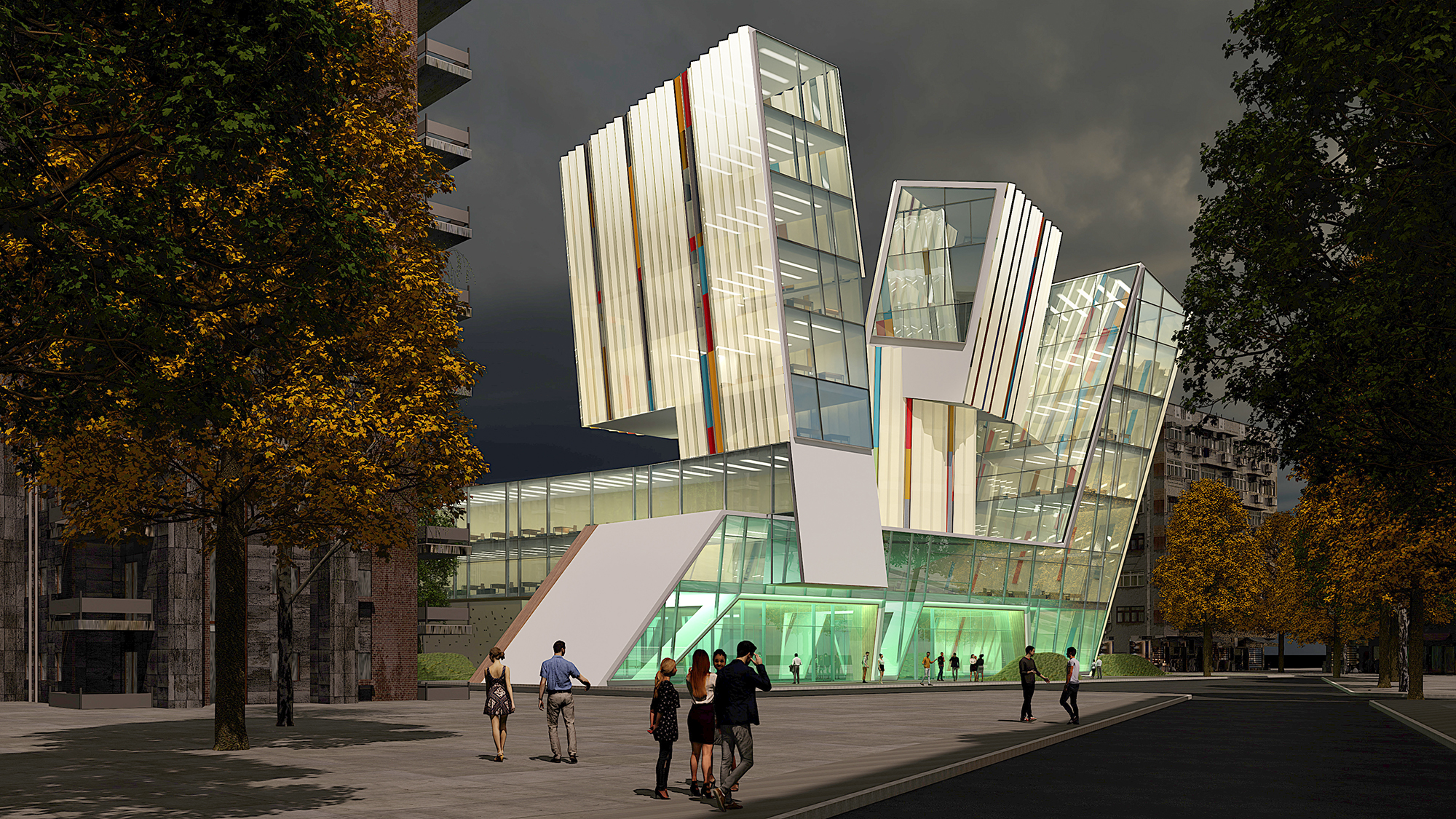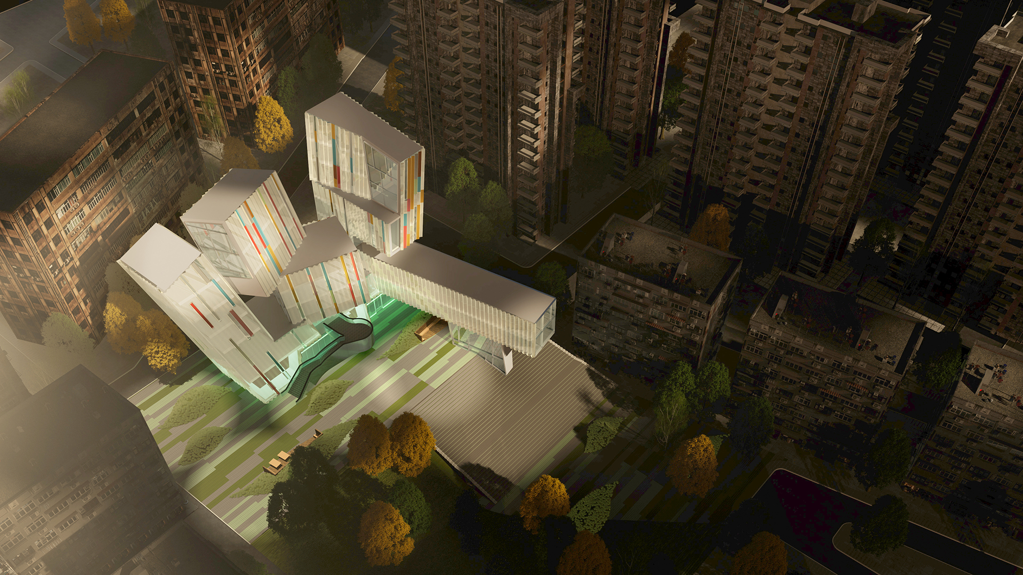 Architecturally, CoZone takes the form of an assemblage of translucent and transparent volumes, combined into a sculptural object. Clad in luminous white panels, the building establishes a striking visual contrast to its context—a landscape characterized by the mass housing typologies of the Soviet era. Rather than mimic or defer to its surroundings, CoZone asserts creative energy. It is not monumental, but deliberate: a self-contained spatial proposition that positively redefines the atmosphere around it.