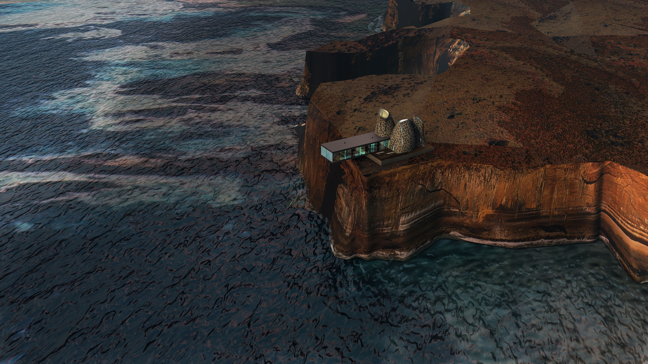 Our solution creates a simple silhouette dominating a prominent cliff. It is simultaneously a beacon with strong footings in the rocks, providing a sense of stability and permanence, and a vulnerable delicate glass box hovering above the churning waves.