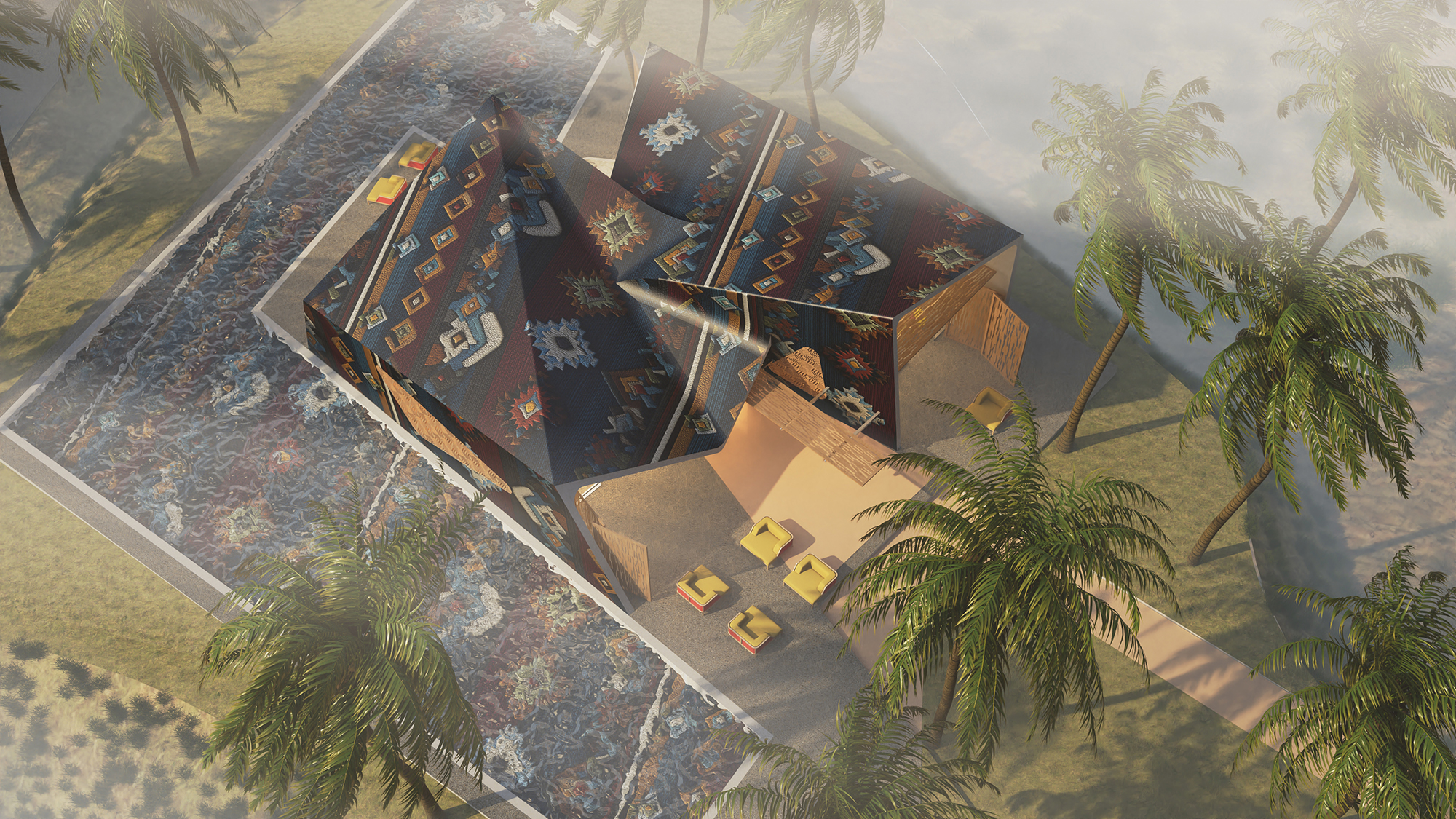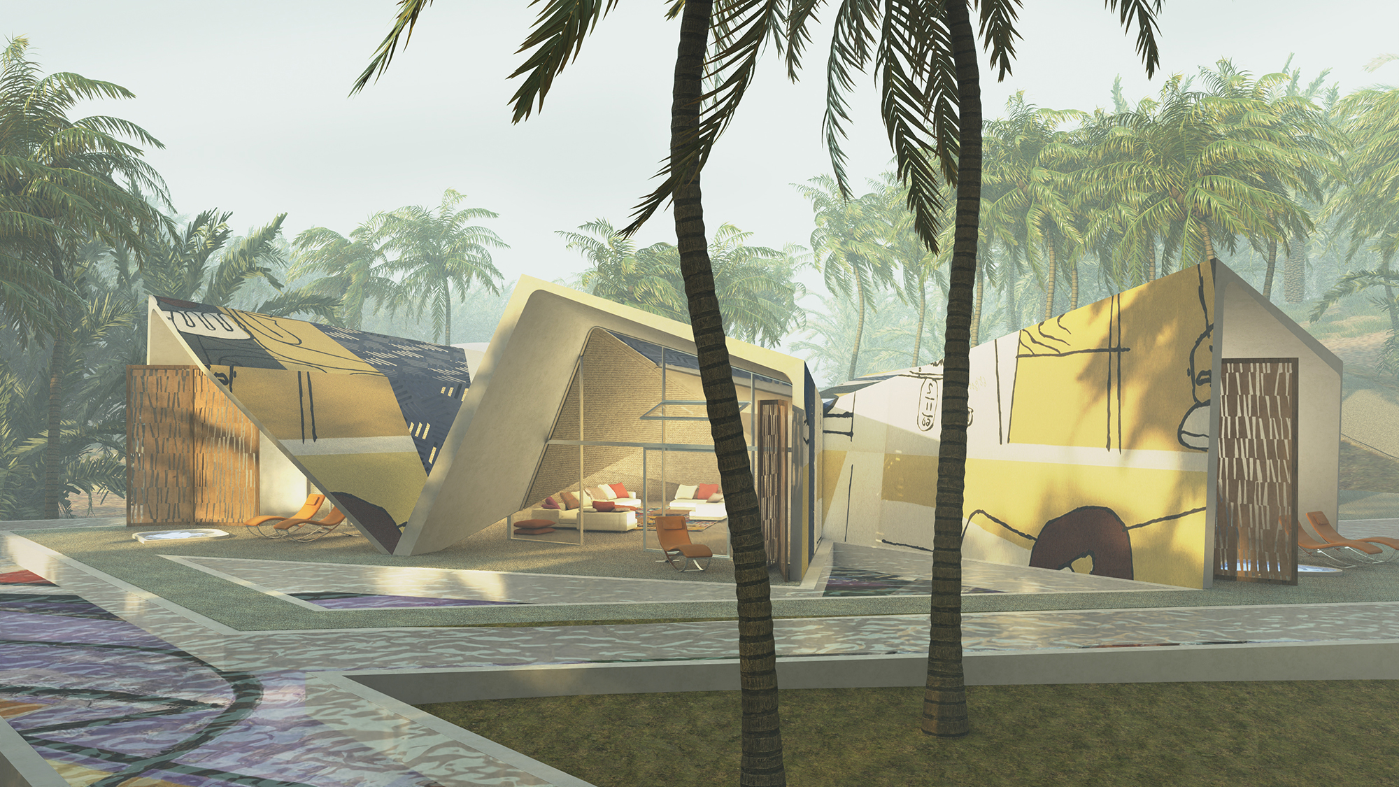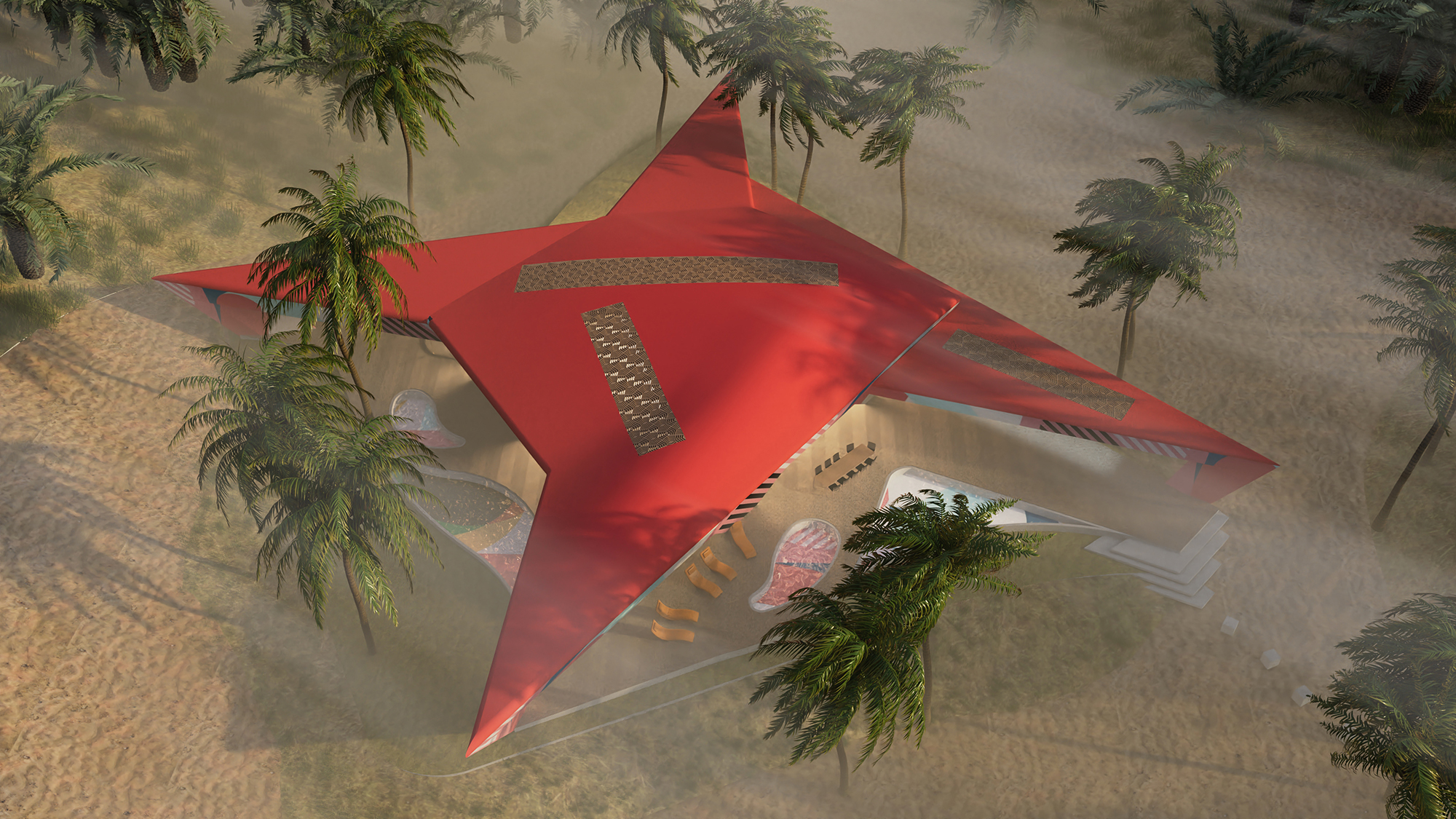 The forms are fluid and improvisational — folded, layered, and stretched as though shaped by wind or draped fabric. The façades become canvases for large-scale painted motifs, merging the vocabulary of contemporary abstract art with the intricate geometries and ornament of Bedouin textiles. These painterly surfaces serve as an expression of cultural continuity.