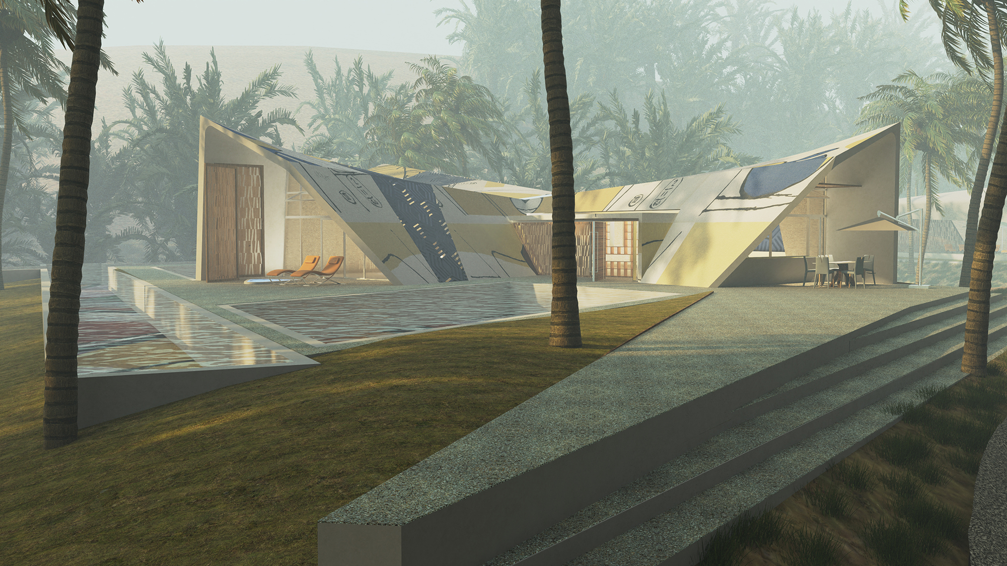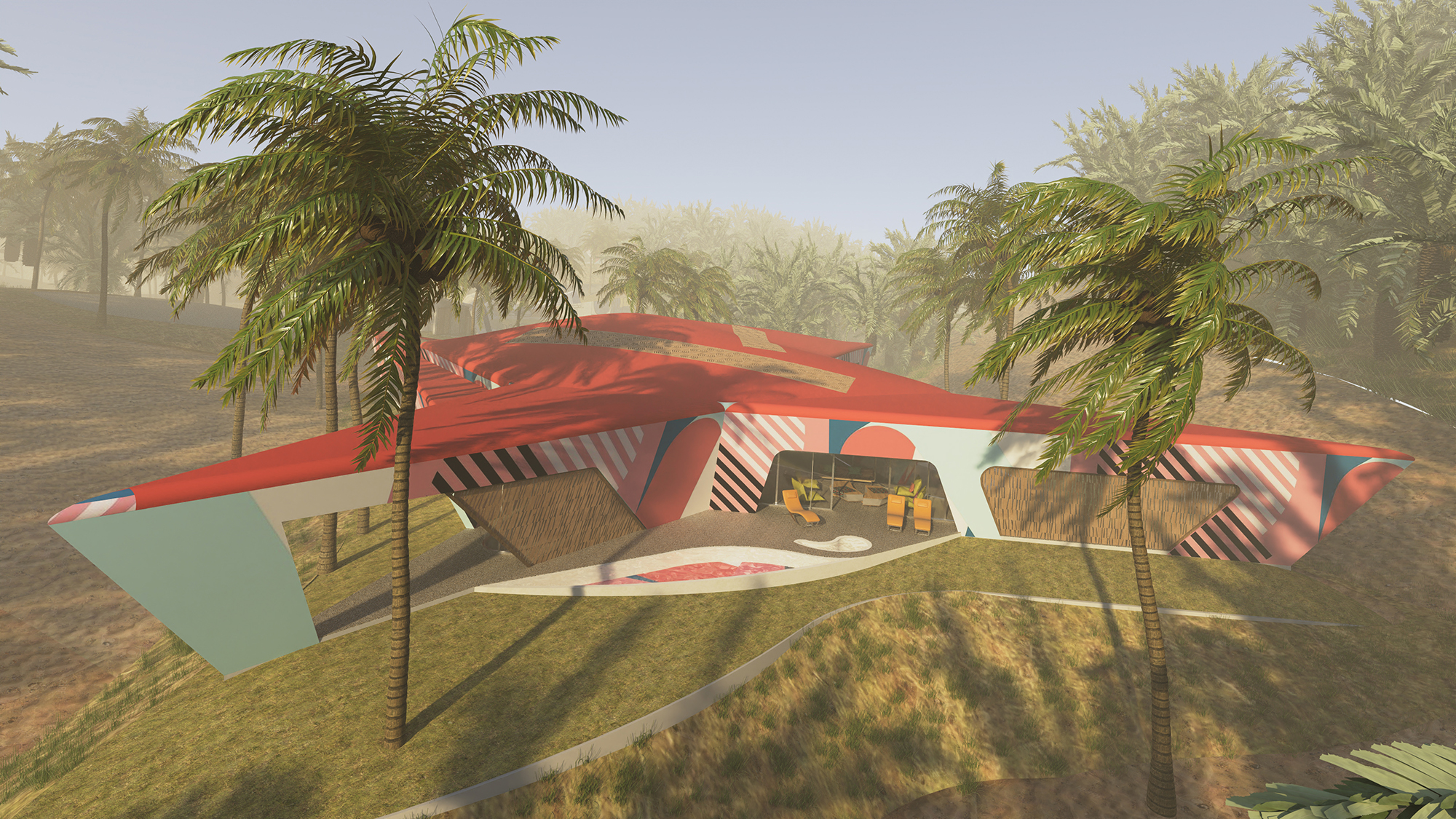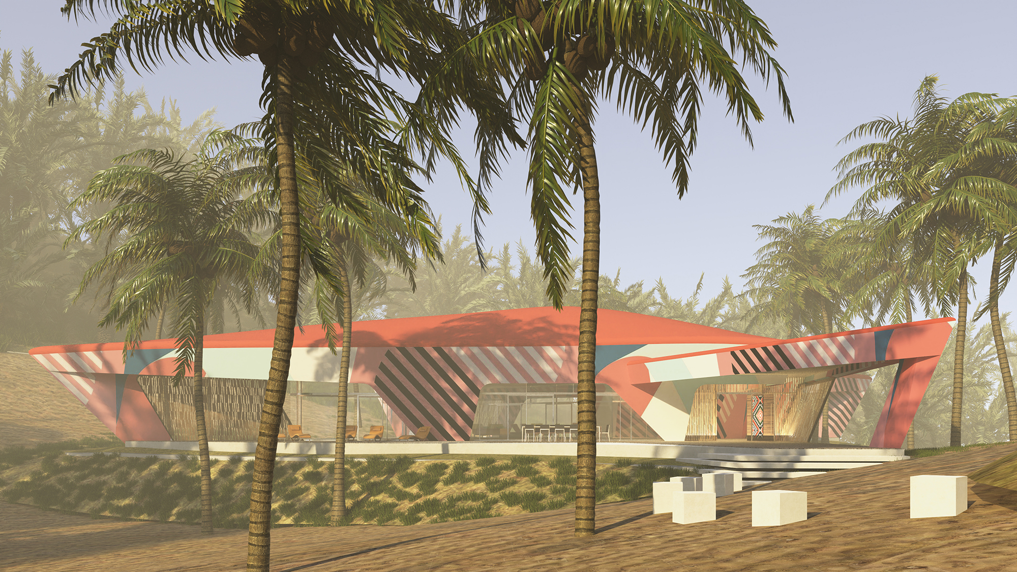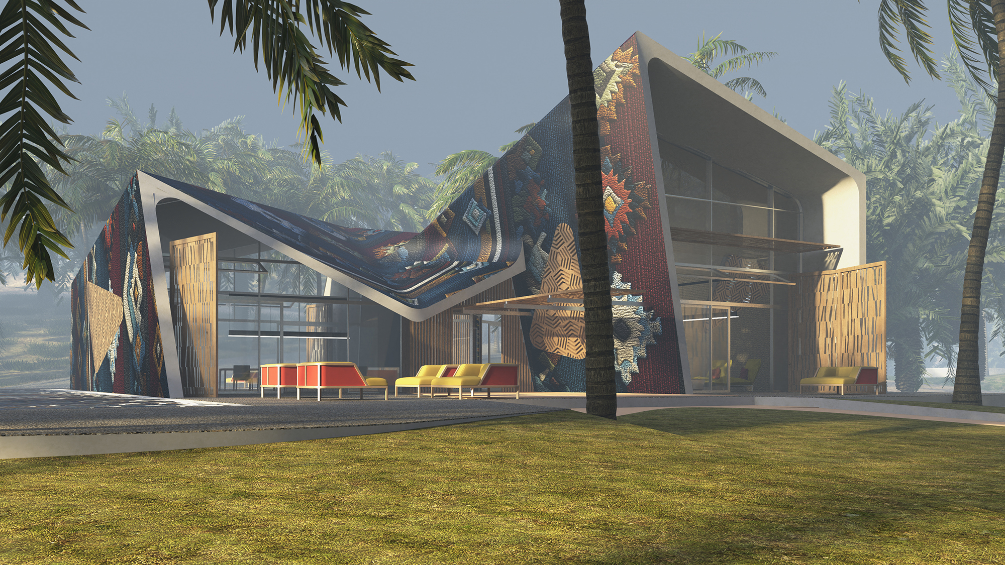 The forms are fluid and improvisational — folded, layered, and stretched as though shaped by wind or draped fabric. The façades become canvases for large-scale painted motifs, merging the vocabulary of contemporary abstract art with the intricate geometries and ornament of Bedouin textiles. These painterly surfaces serve as an expression of cultural continuity.
