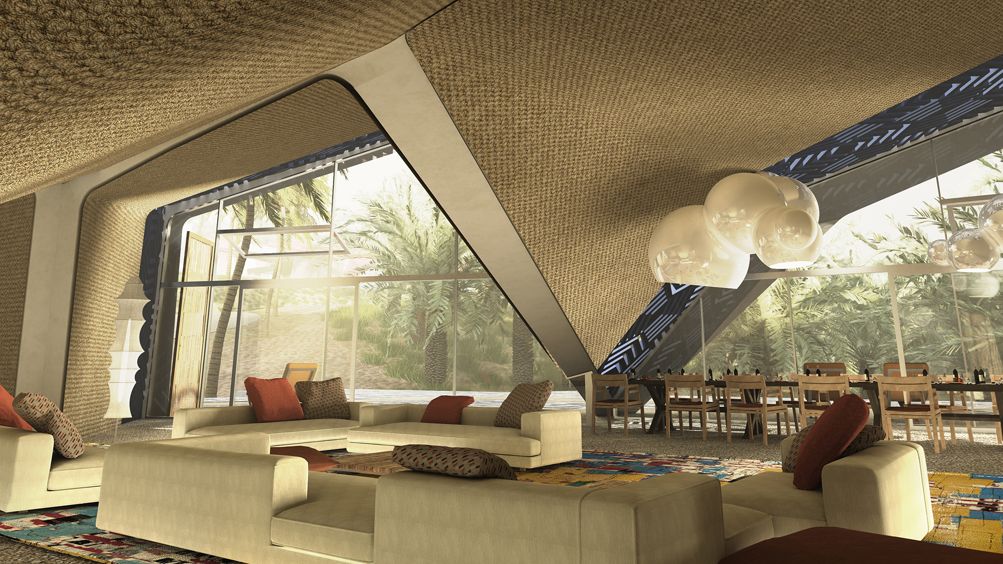 Interiors draw from the richness of Bedouin tent interiors — the intimacy of layered fabrics, the tactile warmth of woven surfaces, and the spatial continuity between enclosure and openness. Wall coverings reinterpret traditional tent cloths through modern materials and techniques.